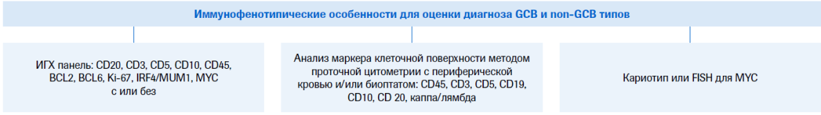 - Кариотип или FISH для перестроек BCL2, BCL6, если MYC позитивный
