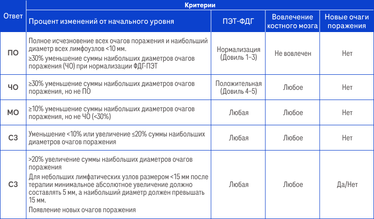 | Полный метаболический ответ | Оценка Довиль 1–3 лимфатических узлов или экстранодальных очагов с остаточной опухолевой массой или без нее |