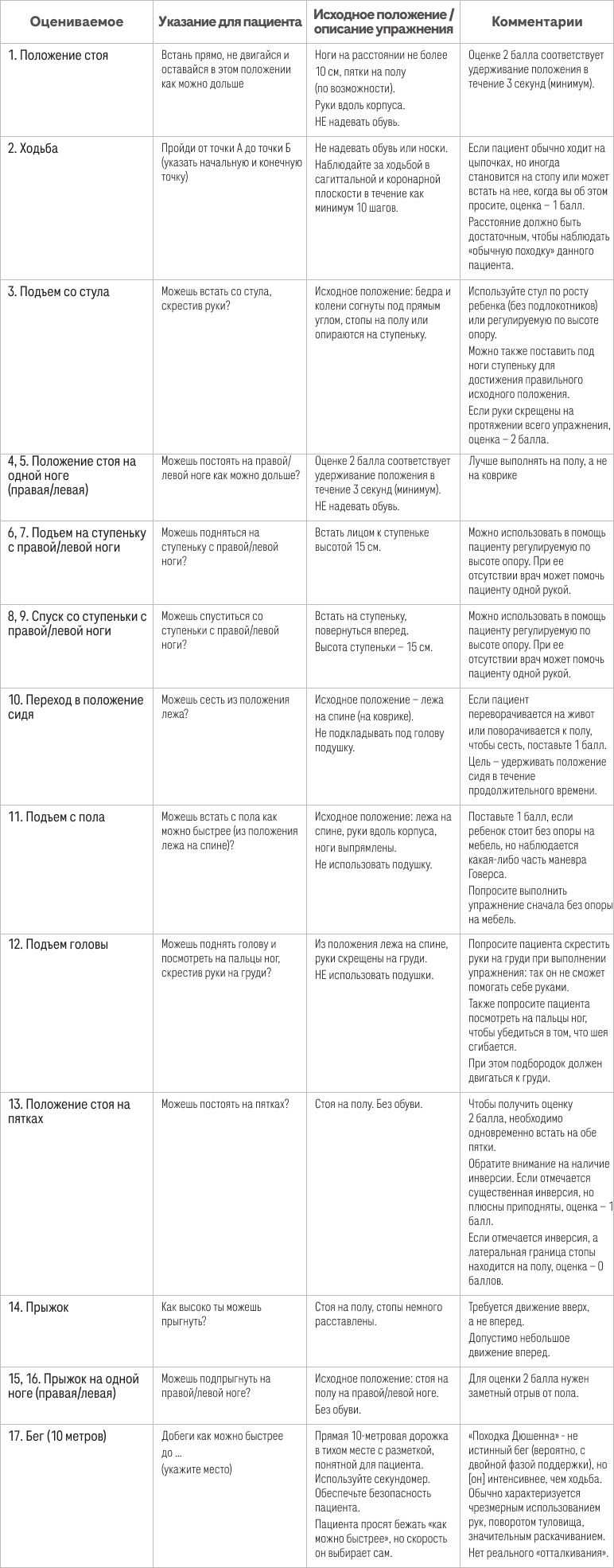 Шкала состоит из 17 пунктов, которые позволяют оценить способность выполнять различные действия: от нахождения в положении стоя (пункт 1) до бега (пункт 17), включая те действия, способность выполнения которых у пациентов с МДД, как известно, при отсутствии лечения постепенно ухудшается — такие как вставание с пола, переход из положения лежа в положение сидя и вставание из положения сидя. С помощью этой шкалы также можно оценить способность пациента поднимать голову и стоять на пятках, — некоторые трудности при выполнении этих действий могут возникать на ранних стадиях заболевания. Пациенты с МДД, не получающие лечения, обычно не могут полноценно выполнять некоторые действия, например прыгать на одной ноге, прыгать на двух ногах или бегать. Однако эти действия также оцениваются с помощью этой шкалы, поскольку их могут выполнять пациенты, которые ежедневно получают стероиды1.