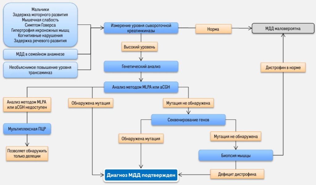 Ранняя диагностика мышечной дистрофии Дюшенна (МДД) является жизненно важной для своевременного проведения медицинских вмешательств и эффективного контроля заболевания. Диагностика МДД включает проведение клинических обследований и генетического тестирования, изучение семейного анамнеза, а в некоторых случаях — еще и проведение биопсии мышц. Диагностический алгоритм состоит из следующих этапов: