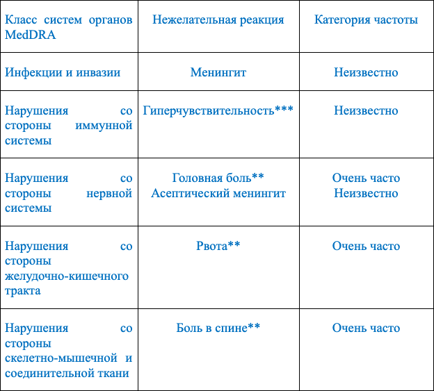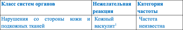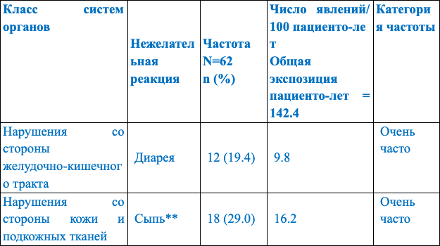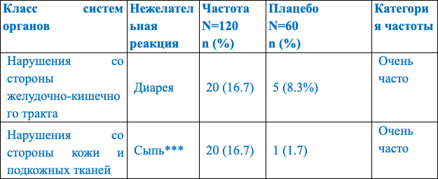 Со стороны пищеварительной системы: часто – диарея. Со стороны кожи и подкожно-жировой клетчатки: часто – макуло-папулезная сыпь, эритема, дерматит, аллергический дерматит, папулезная сыпь, фолликулит.