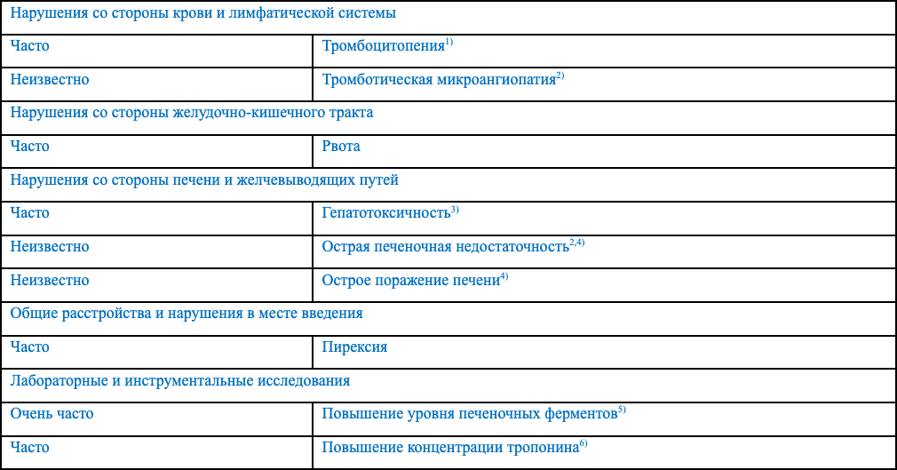 Отсутствуют. Требуется соблюдать осторожность при тромбоцитопении и нарушениях свертывания из-за повышенного риска кровотечений, а также при нефротоксичности из-за возможного ее нарастания.