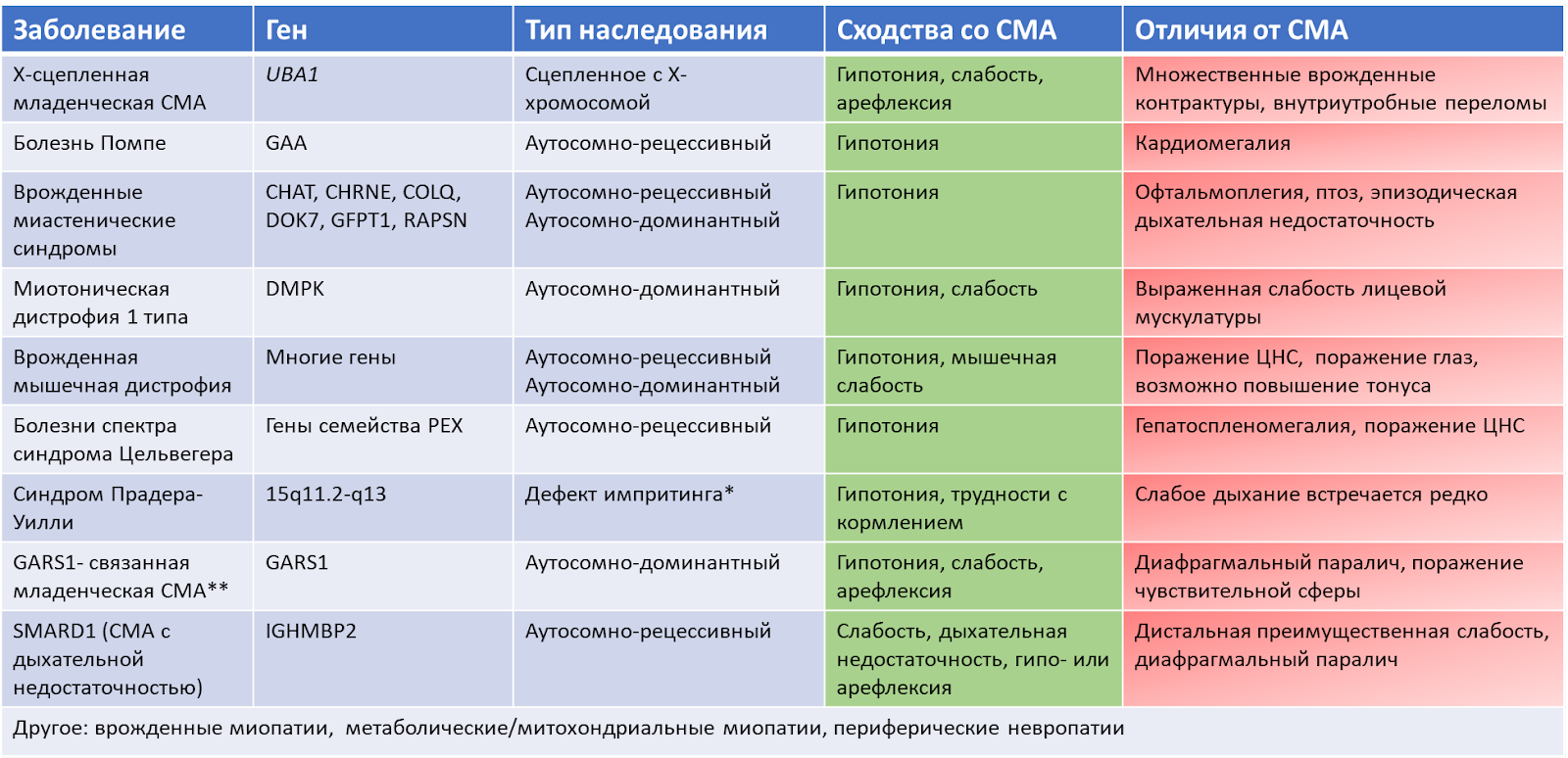 Адаптировано из: Prior TW, Leach ME, Finanger E. Spinal Muscular Atrophy. 2000 Feb 24 [updated 2020 Dec 3]. In: Adam MP, Mirzaa GM, Pagon RA, Wallace SE, Bean LJH, Gripp KW, Amemiya A, editors. GeneReviews® [Internet]. Seattle (WA): University of Washington, Seattle; 1993–2023. PMID: 20301526. *Синдром Прадера-Уилли обусловлен отсутствием экспрессии импринтированных генов в области 15q11.2-q13 хромосомы 15, обусловленной отцовским фактором (отцовская делеция, материнская непарная дисомия 15 и редко дефект импринтинга). Риск возникновения PWS у братьев и сестер пострадавшего ребенка зависит от генетического механизма, который привел к отсутствию экспрессии отцовской области 15q11.2-q13. **Патогенетические варианты GARS1 также связаны с нейропатией Шарко-Мари-Тута типа 2D (CMT2D) и дистальной спинальной мышечной атрофией V (dSMA-V) (см. GARS1-ассоциированная аксональная нейропатия). CMT2D и dSMA-V характеризуются подростковым или ранним взрослым началом уникальных моторных и сенсорных проявлений с возрастом начала заболевания от восьми до 36 лет.