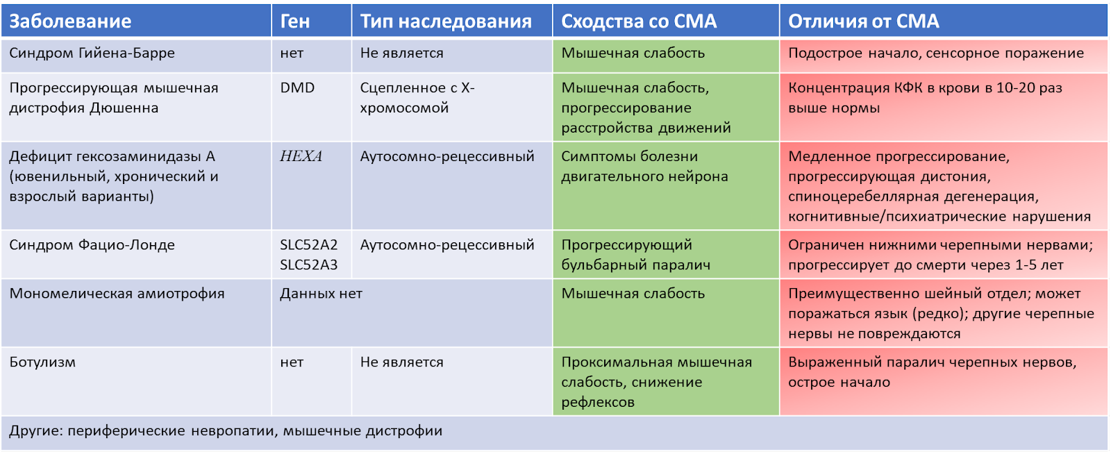 Дифференциальный диагноз должен проводиться в первую очередь с врожденными структурными миопатиями, врожденными мышечными дистрофиями, митохондриальными миопатиями, различными заболеваниями, проявляющимися симптомокомплексом «вялого ребенка» (новорожденный или младенец с мышечной гипотонией). При симптомокомплексе «вялого ребенка» существуют две основных клинических ситуации: это новорожденный с мышечной гипотонией или ребенок более старшего возраста с мышечной гипотонией и задержкой моторного развития или его регрессом. Сначала исключаются все острые состояния – сепсис, острые инфекционные энцефалопатии, гипоксически-ишемические энцефалопатии, наличие травмы, внутриутробные инфекции. Затем необходимо понять, сопровождается ли мышечная гипотония мышечной слабостью или нет, а у детей с задержкой развития, касается ли задержка и когнитивных функций. В отличии от множества заболеваний с центральными параличами СМА дает клинику периферического паралича, то есть, имеют место выраженная мышечная слабость, отсутствуют сухожильные рефлексы, и не страдают когнитивные функции.