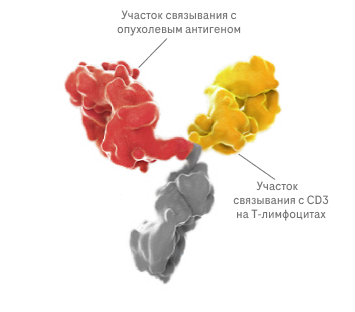 - Антитело состоит из одного Fab‑фрагмента, который связывается с белком CD3 на поверхности T-лимфоцитов, и еще одного Fab‑фрагмента, который связывается с антигенами, экспрессируемыми на поверхности опухолевых клеток4