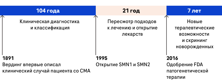 Долгое время лечение СМА сводилось к поддерживающей терапии или паллиативной помощи. Пациенты с первым, самым тяжелым, типом СМА, как правило, не доживали и до двух лет.